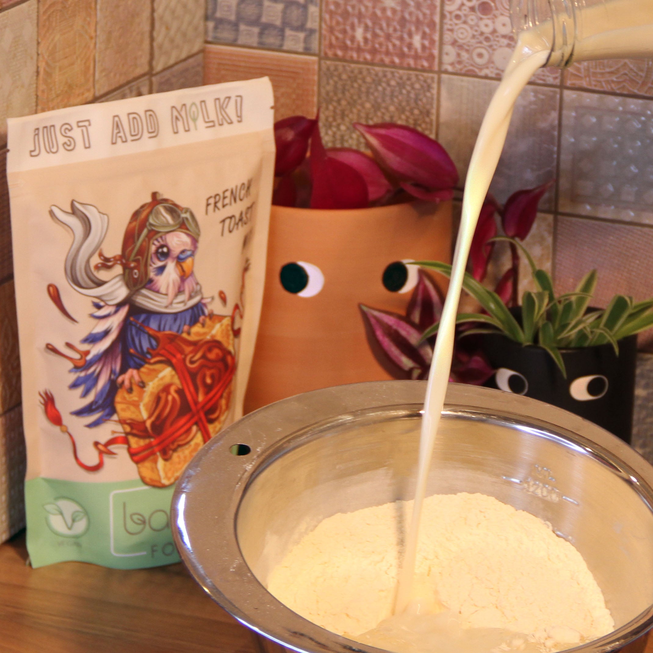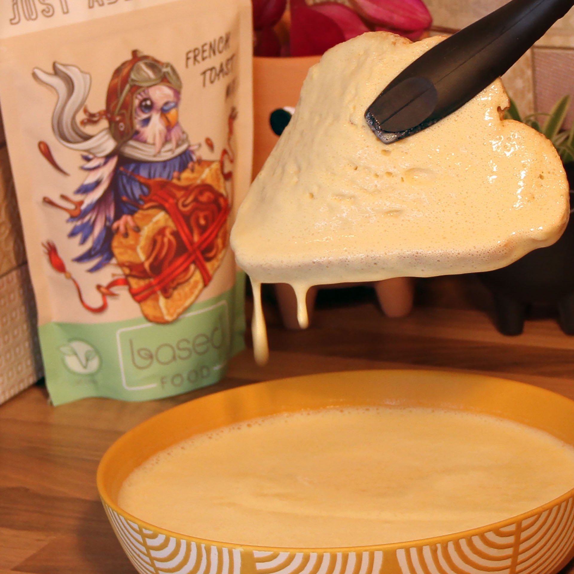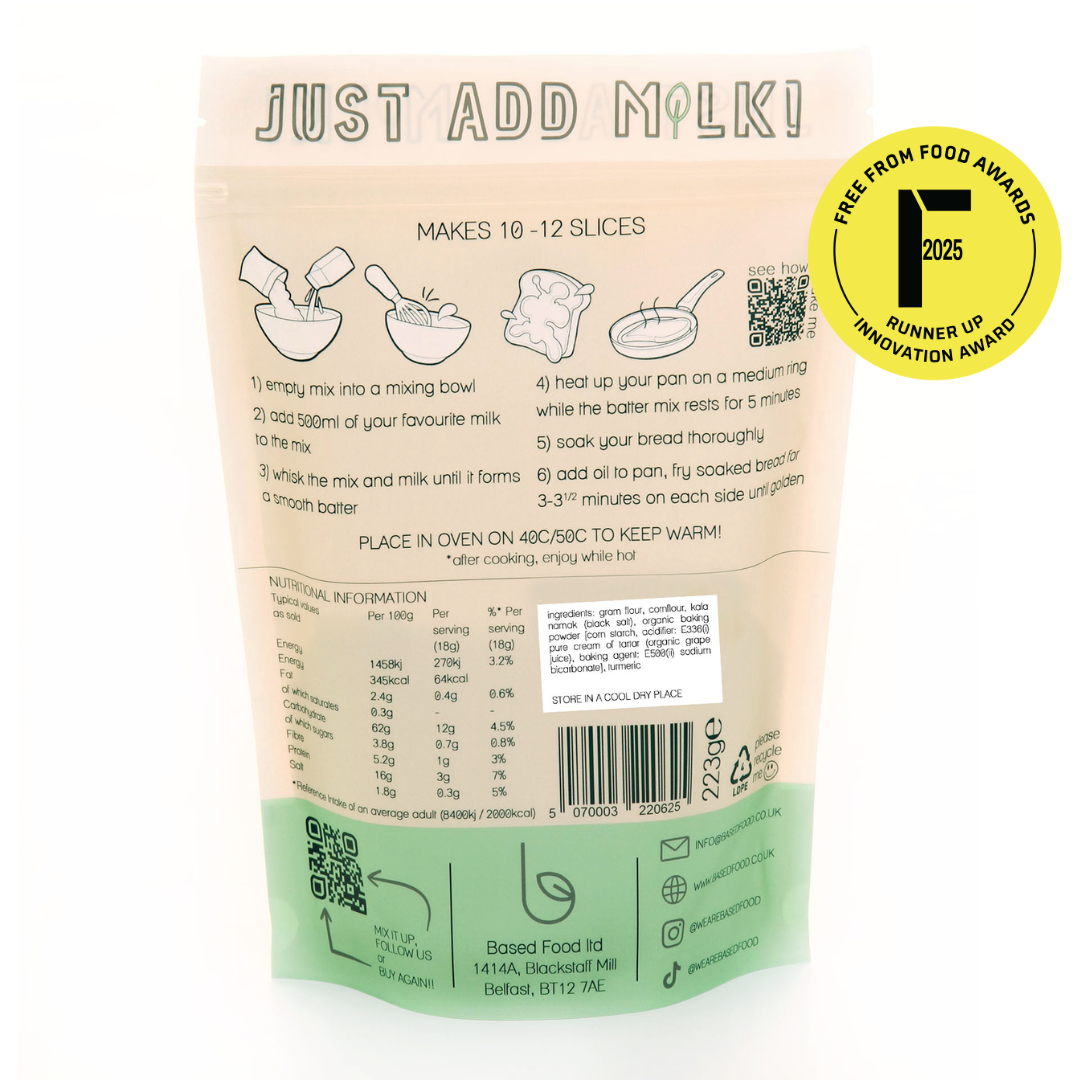 Simply add your favourite plant-based milk to your mix, whisk, and dip your bread. Cook until golden brown, and enjoy a hearty and satisfying breakfast.